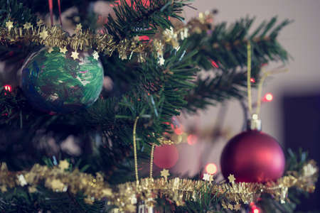 Christmas tree decorated with traditional ornaments as lights, baubles and tinsel, toned retro effect.