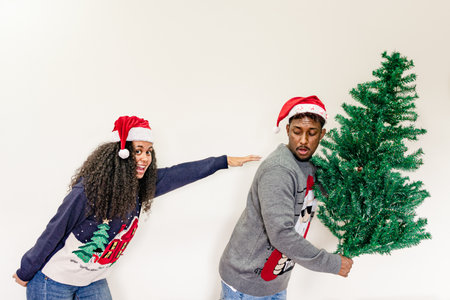 Couple running with Xmas tree. Christmas friends wearing santa hat holding xmas tree. White background