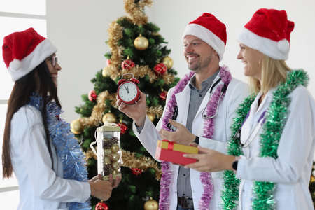 Businessman giving present box to woman in office, celebrating christmas eve holiday with gifts. Coworkers feeling happy about festive season with xmas ornaments and decorations.