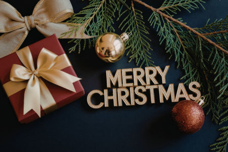 A beautifully wrapped red gift box with gold ribbon, surrounded by fir branches and Christmas ornaments on a dark background, with a 'Merry Christmas' sign in gold letters.