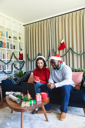 Happy diverse couple wearing santa claus hats, using laptop for video call. Spending quality time at christmas together.