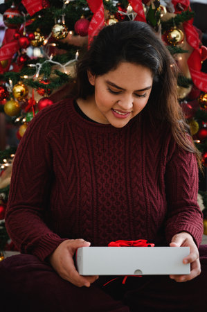 Merry Christmas! Happy young woman in santa hat opening christmas gift under christmas tree with lights in festive decorated modern room. Winter holidays preparations.