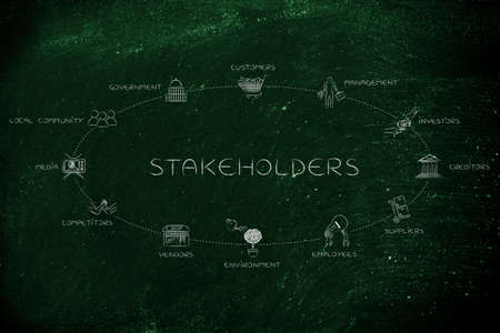 Stakeholders text with keywords isolated on white board background. Chart or mechanism concept.