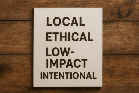 Promoting sustainable practices with local, ethical, low impact, and intentional branding values printed on a paper sheet placed on a wooden table