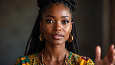 Confident African woman with braided hair in high bun wearing traditional outfit addressing crowd