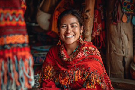 Woman with braided hairstyle, dressed in vibrant traditional clothing, adorned with jewelry, exuding cultural elegance and charm in a softly lit environment