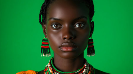 An expressive face with bright eyes showcasing a unique necklace that reflects cultural heritage set against a lush green backdrop