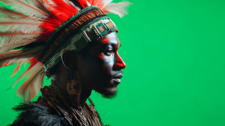 This striking close-up features a male model adorned with intricate tribal jewelry and unique body art, highlighting rich cultural elements and craftsmanship.