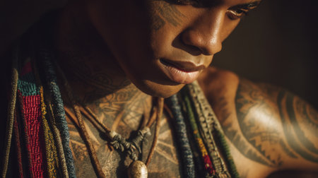 A captivating portrait of a young man adorned with intricate tattoos, showcasing personal expression and cultural heritage, captured in soft, warm lighting.