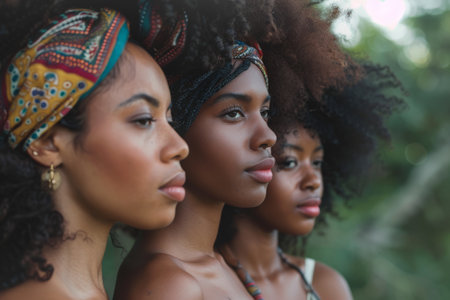 Side profile portrait of three women wearing colorful headwraps, highlighting their natural beauty and cultural identity against a blurred green background.