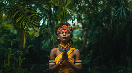 A determined woman stands in a jungle, dressed in colorful adventure attire, with her hands in a prayer position amidst rich green foliage and tropical plants.