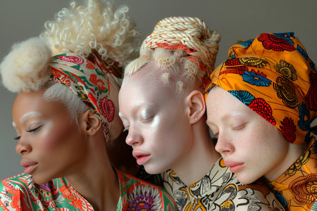 A close-up portrait of three african individuals dressed in vibrant ethnic clothing.