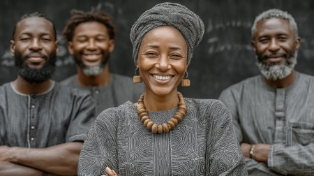 Diverse smiling adults in matching traditional outfits stand together, showcasing pride and culture.