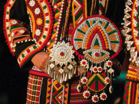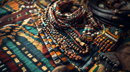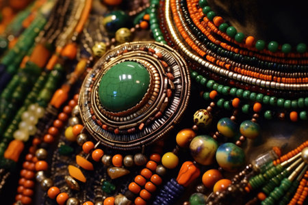 detailed close-up of tribal beadwork and jewelry, created with generative ai