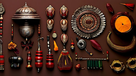A vibrant and detailed collection of traditional Indian cultural artifacts and decorative items, including intricate jewelry, musical instruments, and ceremonial objects, arranged artistically on a dark background.
