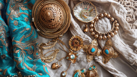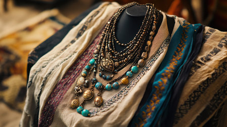 Colorful handmade jewelry and textiles showcase diverse cultural traditions and elegance generated by artificial intelligence