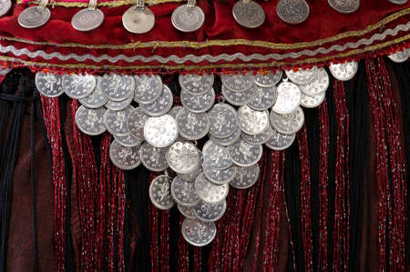 classic Indian Odissi dance costume with belt decoration. close up, copy space. classical Indian culture and traditions. Odissi dancer
