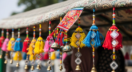 A vibrant line of colorful, decorative tassels with beads, mirrors, and small bells hangs from an awning, likely at a market in India. The intricate handmade decorations in shades of red, yellow, blue, and pink showcase traditional craftsmanship and cultural artistry. The image is festive, bright, and full of cultural character.