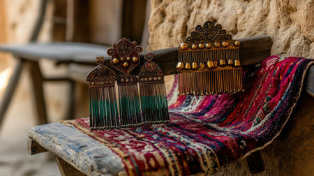 A stunning display of traditional handmade hair accessories arranged on a vibrant vintage textile, showcasing intricate craftsmanship and cultural heritage.