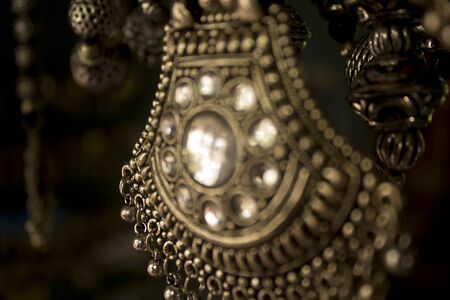Picture of handmade Indian necklace and earring is displayed in a street shop for sale. Indian handicraft and art