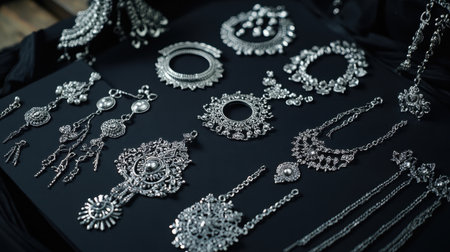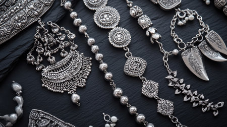 An exquisite array of silver jewelry pieces, elegantly arranged on a dark surface, highlighting intricate designs and exceptional craftsmanship for fashion lovers and artisans alike.