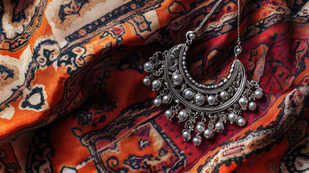 This captivating image features an intricately designed silver necklace elegantly placed on rich red fabric, highlighting the beauty of traditional craftsmanship.