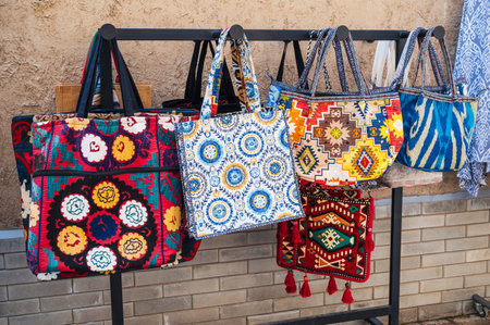 fabric bags with a traditional bright colorful pattern at oriental bazaar in Uzbekistan