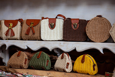 Balinese traditional handmade rattan woven round shoulder bags with leather handles at a souvenir street shop. Bali, Indonesia.