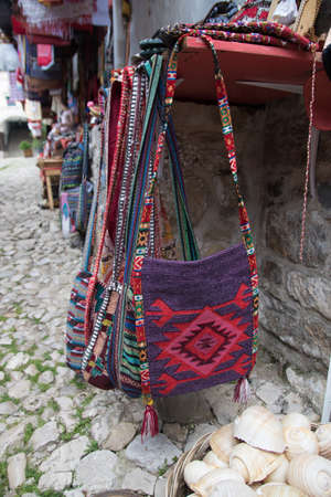 KRUJE, ALBANIA - June 2018: Traditional Ottoman market in Kruja, birth town of National Hero Skanderbeg. Flea market in Albania. Antique items and souvenirs for sale.