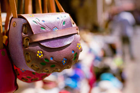 Pink and purple lather purses in the flea markets of Mexico.