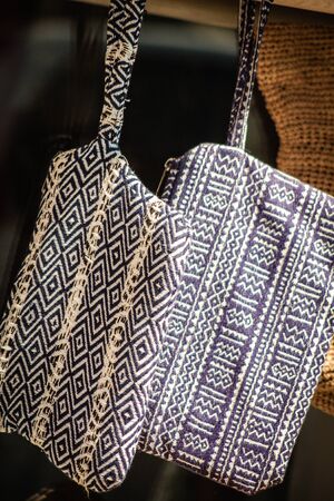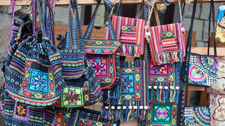 Colorful handmade bag of native hill tribe hanging at the market of countryside in Thailand
