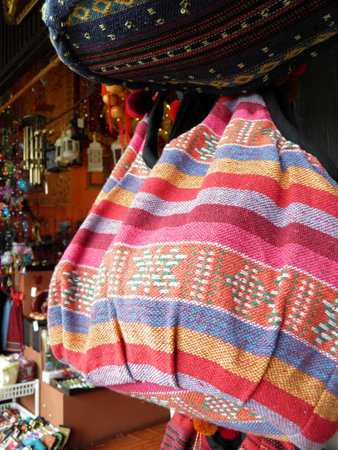 Details of peruvian handcrafted bags at a local market in Cusco, Peru