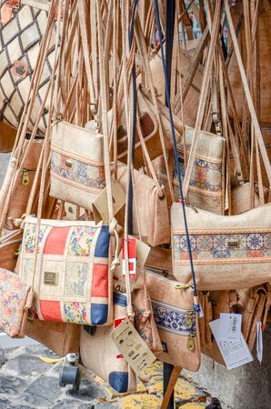 Portuguese souvenirs cork bags at the street market of Nazare, Portugal.