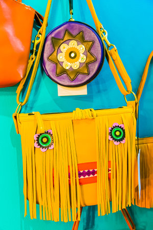 SALENTO, COLOMBIA - JULY 2021. Beautiful handcrafted women's purses at a crafts shop in Salento