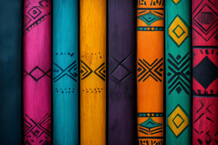 Colorful books with tribal motifs are standing in a row, creating a vibrant and textured display