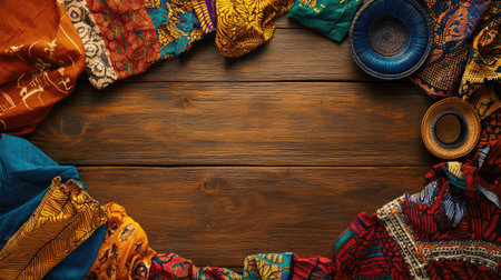 Top view of vibrant African fabrics with traditional patterns, arranged with open space for text