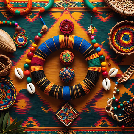 This image presents a richly textured and colorful arrangement of woven textiles and African-inspired beaded ornaments. The background features a prominent teal and orange patterned fabric. Various handcrafted items, including circular woven baskets, necklaces made of vibrant beads, shells, and other natural materials, are artfully displayed. A large, circular woven ornament wrapped in blue, black, and red yarn is a focal point, surrounded by smaller decorative elements. The composition is...