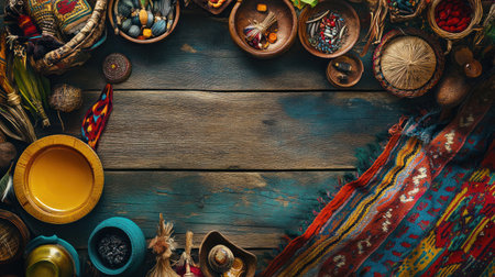 A colorful flat lay for International Day of Indigenous Peoples, showcasing traditional crafts and foods, emphasizing cultural diversity and heritage against a rustic wooden background. --ar 16:9 --v 6.1 Job ID: 270553ae-9500-4764-b485-f5debad368ee