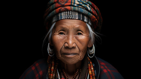 Senior woman in traditional clothing and jewelry, stands against a bold red backdrop, reflecting cultural identity and rich heritage in a captivating portrait
