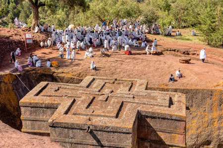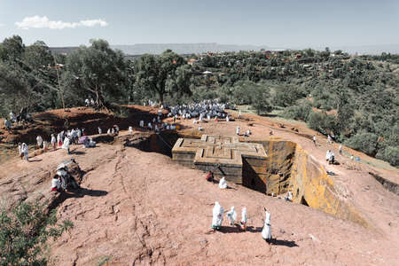 LALIBELA, ETHIOPIA, MAY 1st. 2019, Orthodox Christian Ethiopian people, believers in front of famous rock-hewn St. George's Church after Mass on May 1st. 2019 in Lalibela, Ethiopia