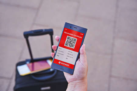 Smartphone in hand displaying on app mobile expired digital green vaccination certificate for Covid-19. Immunity vaccine passport, vaccination certificate, health passport for new normal travel