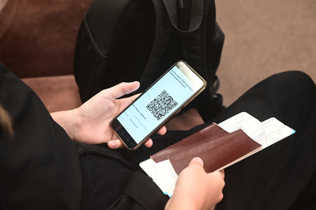 a person at the airport using a mobile app on his phone to show the results of a covid-19 test while traveling