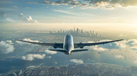 A Modern Airplane Soaring Through the Clouds Above a Cityscape.