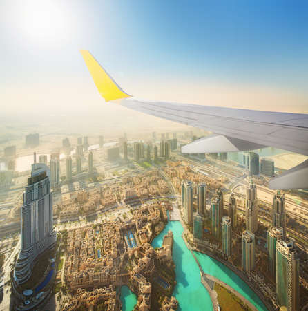 Cityscape of Dubai from aeroplane window, bird view, UAE