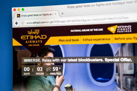 LONDON, UK - MAY 3RD 2017: The homepage of the official website for Etihad Airways, on 3rd May 2017.