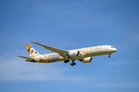 Munich, Germany - May 09, 2021: Etihad Airways Boeing 787-9 Dreamliner with the aircraft registration A6-BLO in the approach to the northern runway 08L of the Munich Airport MUC EDDM