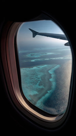 An aerial view from an airplane window captures the ocean and wing. The scene showcases shades of blue and turquoise water. The composition is framed by the window. This image could be used for travel, tourism, and environmental concepts.