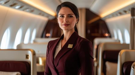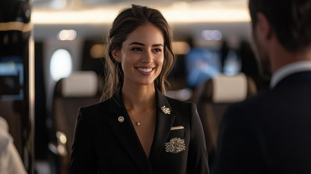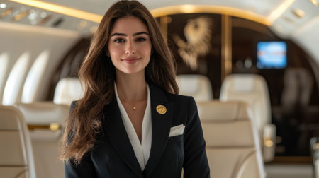 A professional flight attendant stands confidently in a luxurious private jet, showcasing a sophisticated cabin with plush seating and ambient lighting.