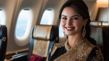 A woman with a warm smile sits inside a luxurious private jet, wearing a beautiful traditional outfit. The cabin features plush seating and large windows offering stunning views.