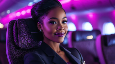 A professional airline attendant with a sleek hairstyle and elegant makeup sits in an aircraft cabin adorned with purple lighting. Her confident smile adds warmth to the travel experience.